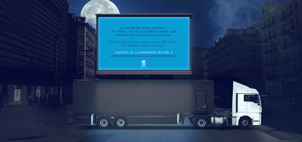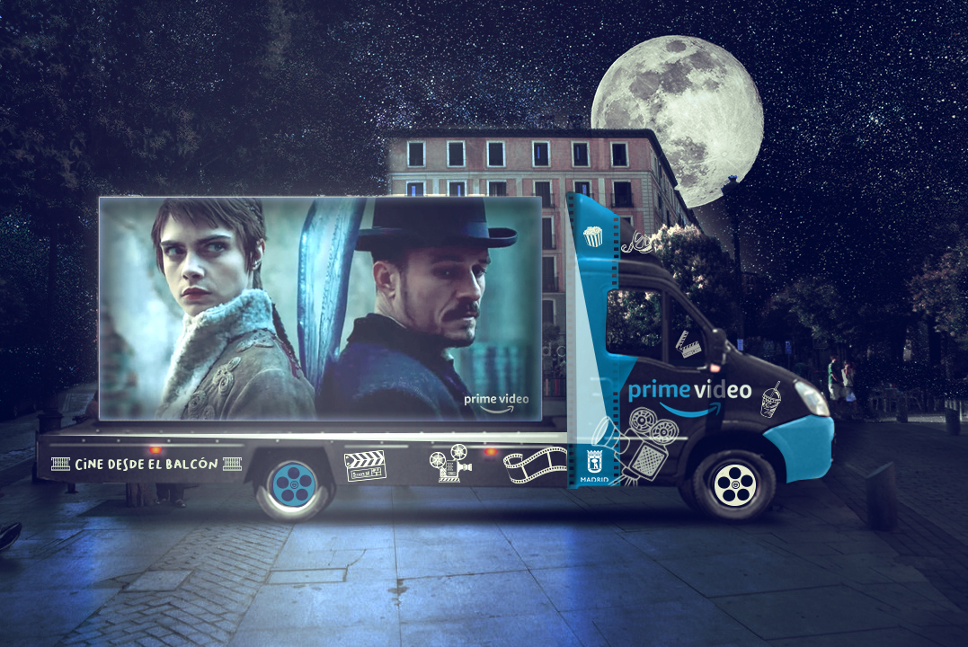NUESTRA IDEA | Creamos #CinedeBalcón, la nueva campaña de Amazon Prime Video con la que hemos llevado, de la mano de IPG Mediabrands y el Ayuntamiento de Madrid, las mejores pelis y series originales de Prime Video a 21 distritos de Madrid, para disfrutar del cine sin moverte de tu casa. Durante una semana, llevamos a distintos puntos de la capital dos enormes pantallas led instaladas en camiones para que vecinos y curiosos disfrutasen desde sus ventanas y balcones de los mejores contenidos audiovisuales de Amazon Prime Video. Desde el anuncio de la campaña, las reacciones se multiplicaron. Las redes sociales se llenaron de mensajes positivos a través del hasthag #Cinedebalcón. Además, decenas de medios nacionales e internacionales se hicieron eco de la iniciativa de Amazon, ensalzando el componente social de la idea y poniendo en valor la iniciativa que busca hacer más llevadero el encierro de los madrileños.