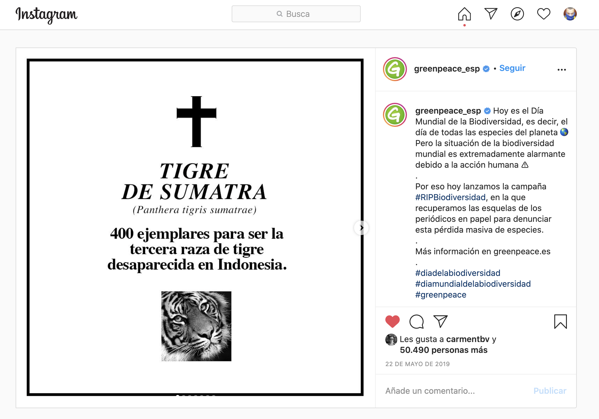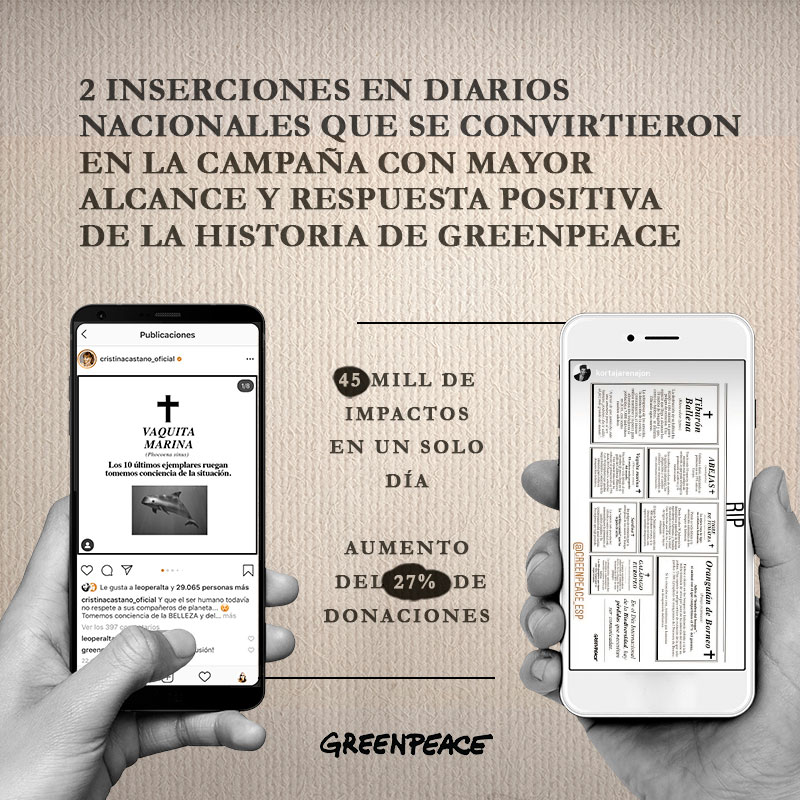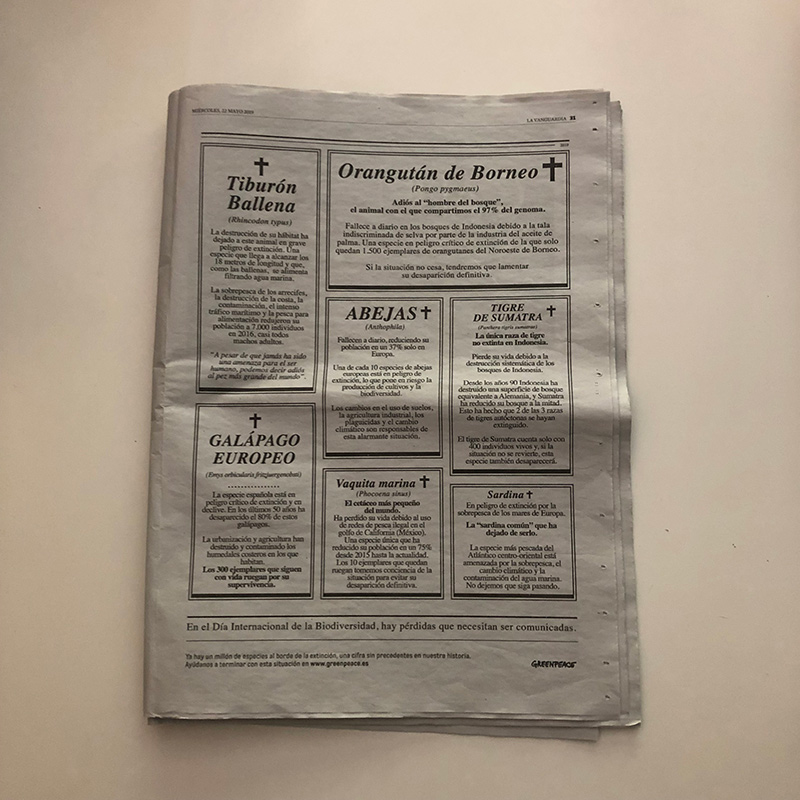 NUESTRA IDEA | Según el último informe de IPBES, hay un millón de especies animales y vegetales amenazadas que podrían desaparecer en sólo unas décadas si no se toman medidas urgentes. Un mensaje que hemos oído tanto, que hemos dejado de escuchar. Por eso, con motivo de la celebración del Día Internacional de la Biodiversidad y de la mano de nuestro partner IPG Mediabrands, decidimos concienciar sobre la extinción de las especies en el mundo, resucitando una sección extinguida del periódico: las esquelas. Hicimos protagonistas al orangután de Borneo, las abejas o el tiburón ballena, entre otros, para que sus pérdidas impactaran como si fueran propias. A partir de ahí, llevamos la conversación a las redes y adaptamos la campaña, creando el primer Instagram Stories de esquelas bajo el lema #RIPBiodiversidad. El apoyo y las reacciones fueron inmediatas, y en tan solo un día, llevamos a cabo la campaña con mayor alcance y respuesta positiva de la historia de Greenpeace España. Nunca antes una esquela había dado tanta esperanza.